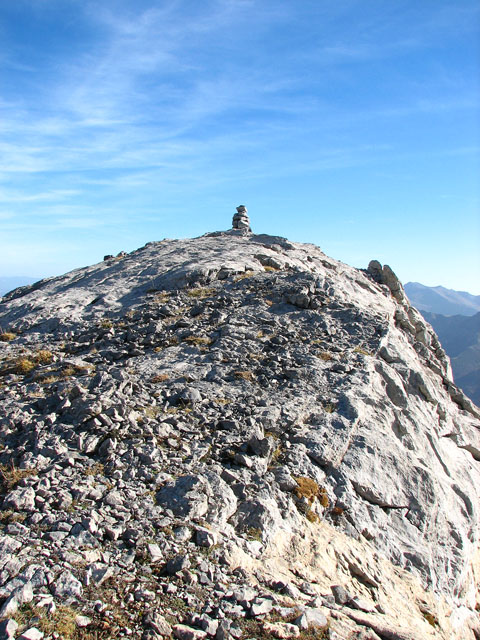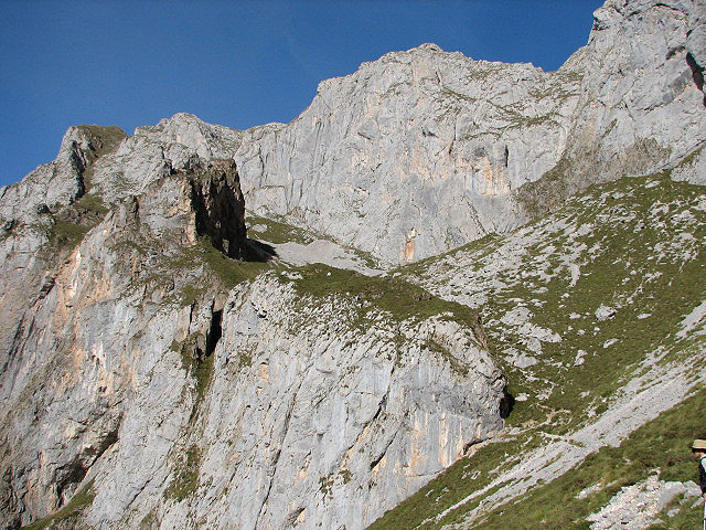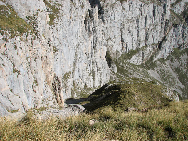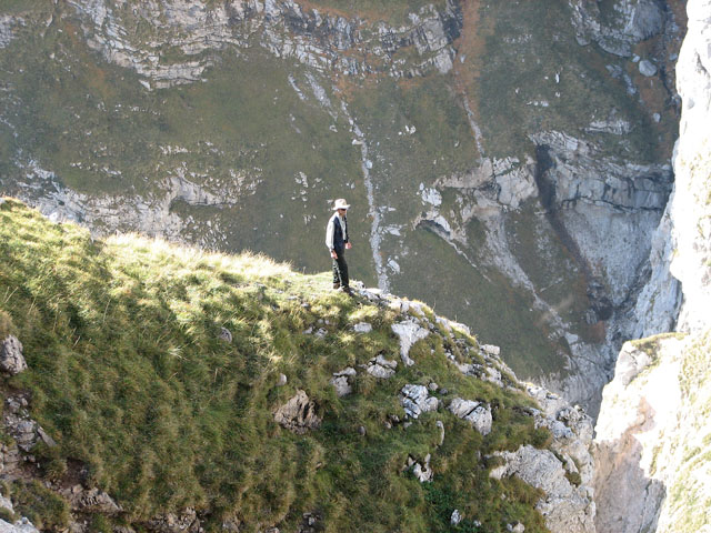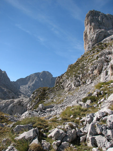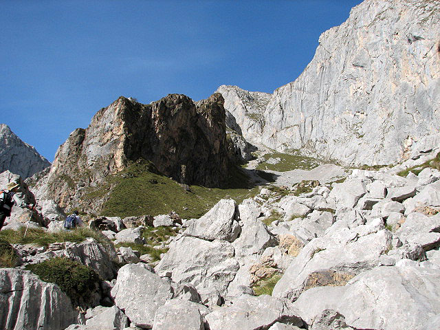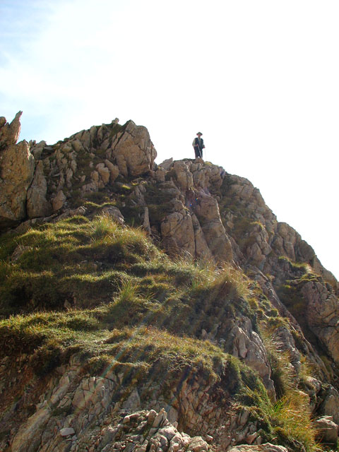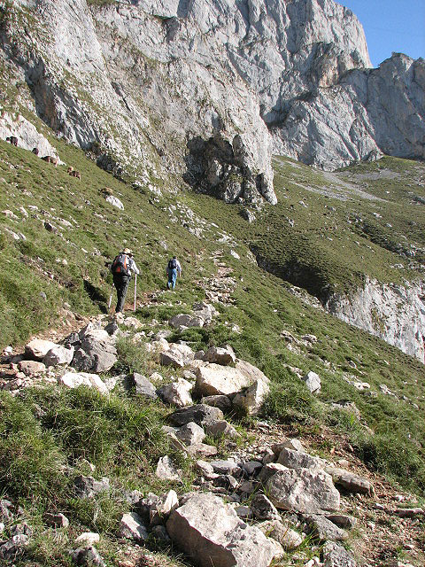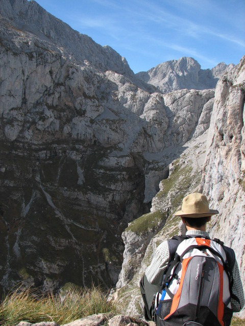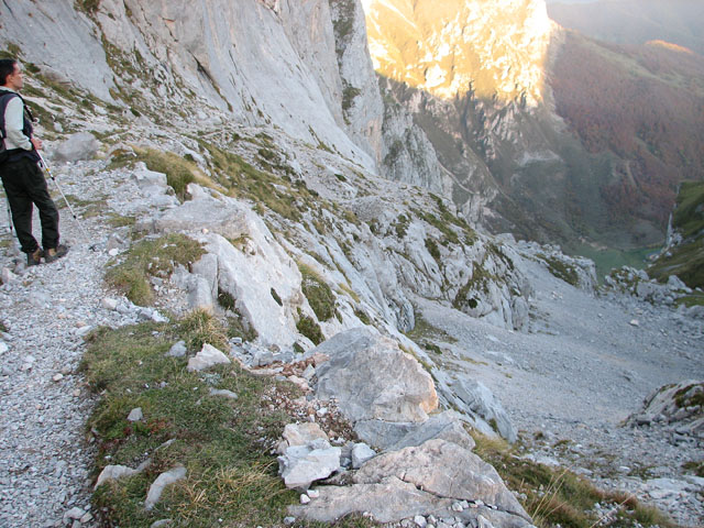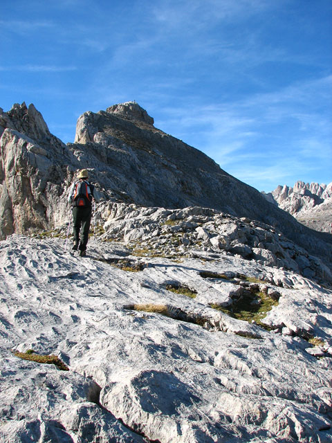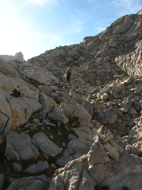 Vemos un hito agajo a la derecha y a mi compañero que se dirige hacia el paso que nos comunica con el sendero que nos baja a Liordes