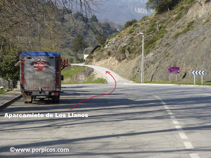 Este es el pueblo de Los Llanos, el aparcamiento, seguimos la flecha roja y ya estamos en ruta