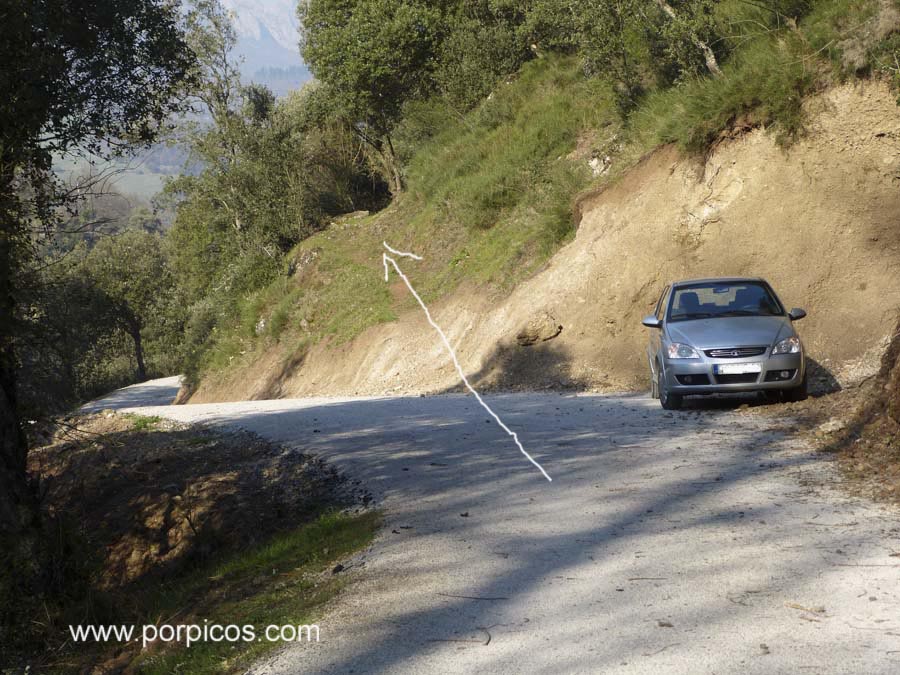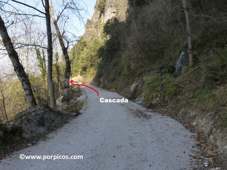 Continuamos hasta ver una cascada, la pasamos y un poco mas alante, donde hay un hueco para dejar un coche, está la entrada