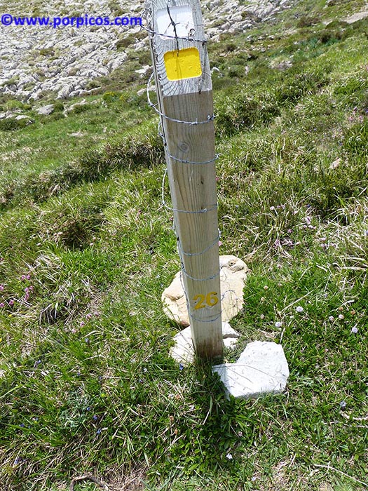 Encima de una plataforma de una roca blanca, se ve a la derecha de mi compañero la baliza que señala el sendero